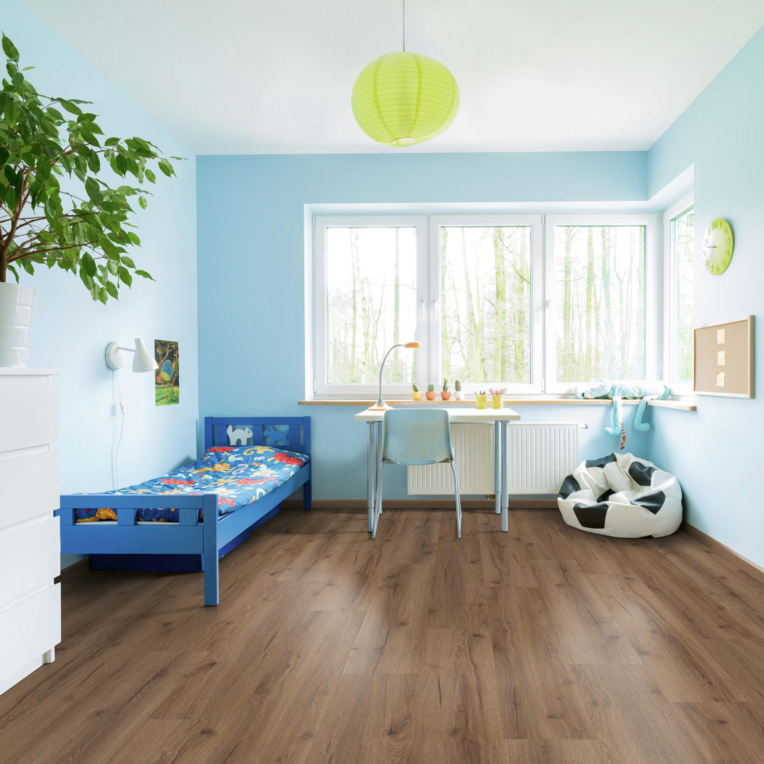 Bei diesem Vinylboden ist die Dämmung schon integriert, was die Installation erheblich vereinfacht. Die Click-Verbindung ist ein Verriegelungssystem, das sich einfach handhaben lässt: Die Dielen fügen sich mit einem Click-Effekt zuverlässig ineinander.